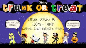 You’re invited to our annual family friendly, Midway Trunk or Treat! Join us for hotdogs and a HAYRIDE too.